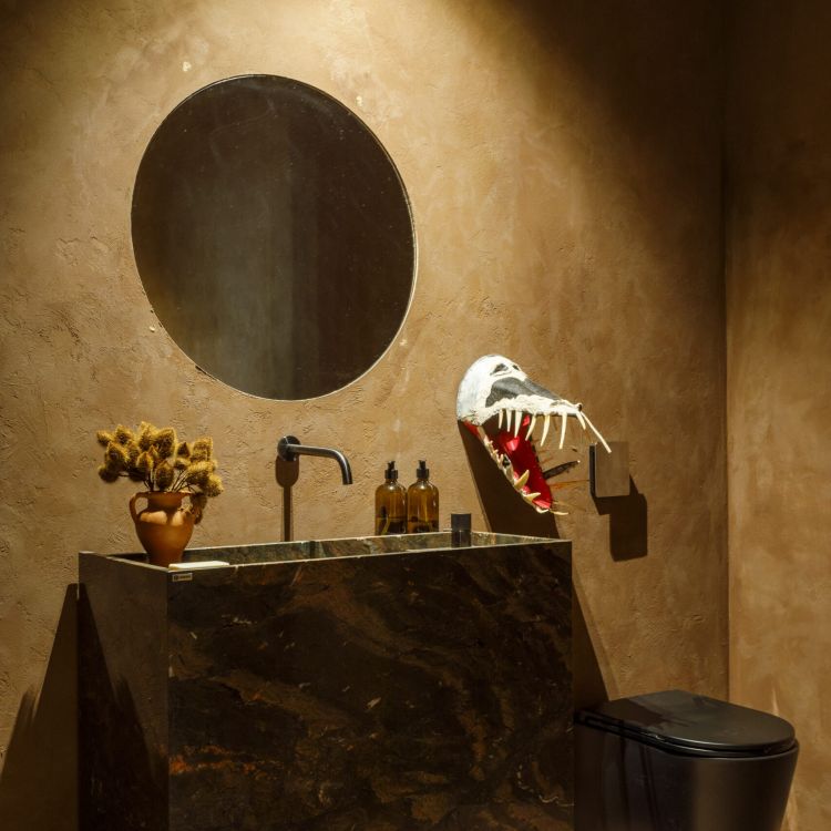 A suíte é um refúgio de descanso do artista onde uma imponente cortina em veludo azul delimita e traz privacidade para o quarto. É neste ponto que o conceito completo do projeto é apresentado, encerrando a travessia espacial e simbólica proposta pela Casa Pedro Neves.