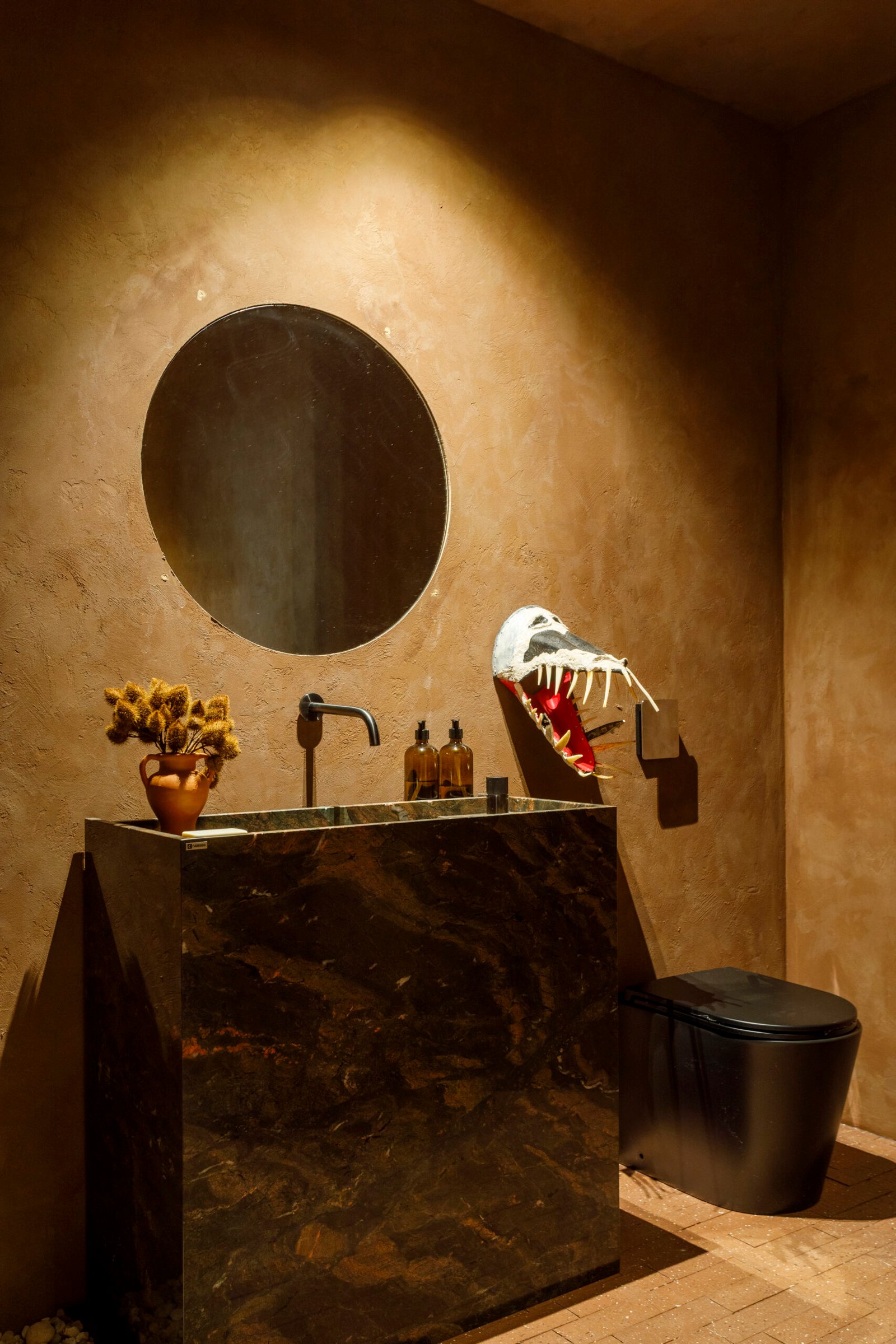 A entrada da casa evoca a terra maranhense. Os elementos em barro e texturas naturais, recebem o visitante com a força do território e a simplicidade acolhedora das casas do interior.