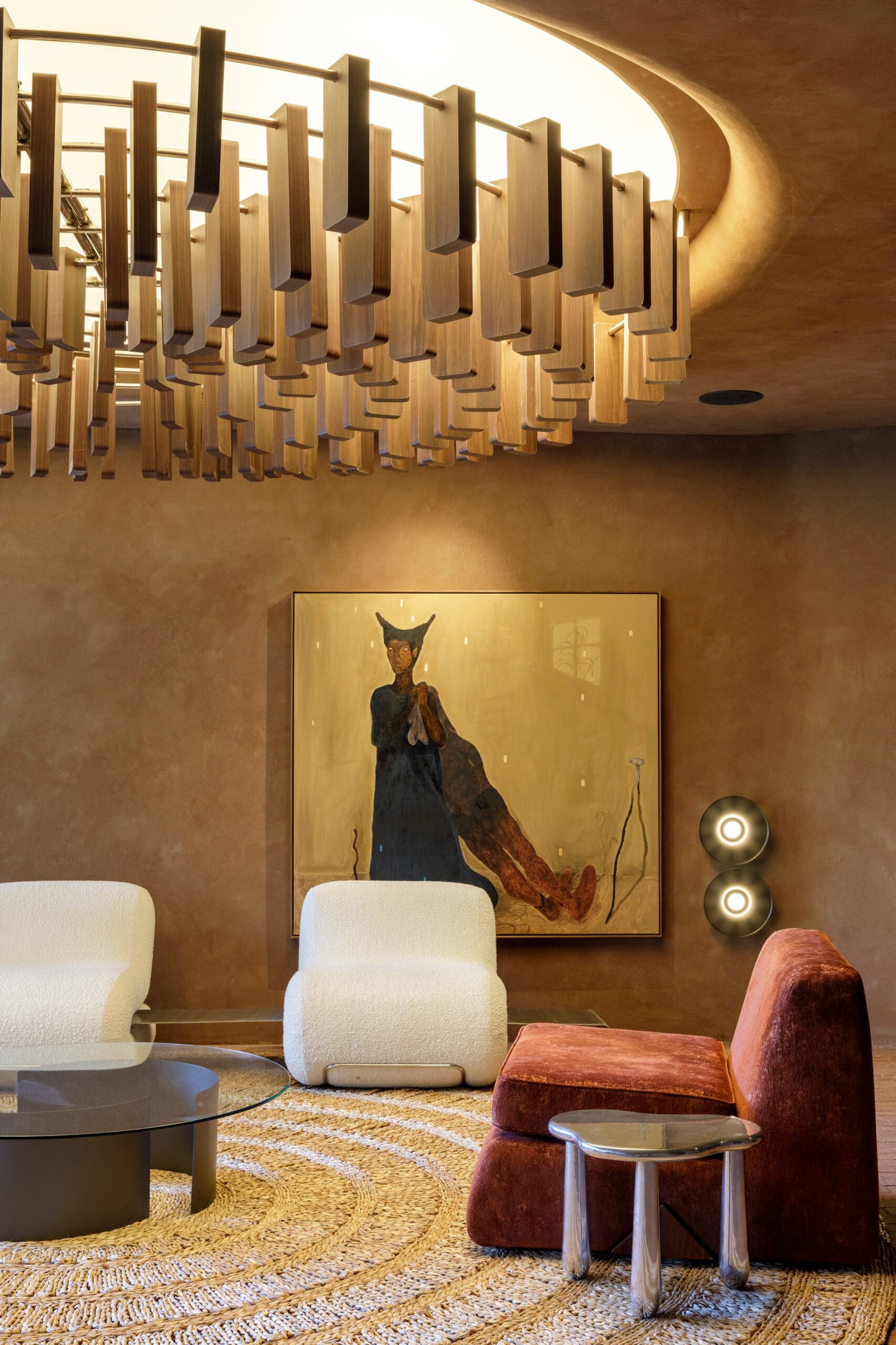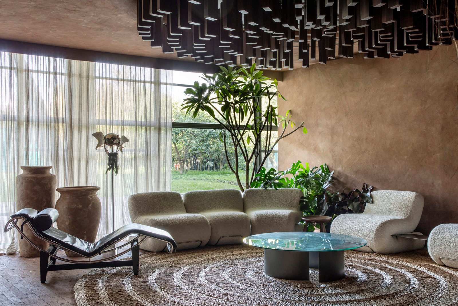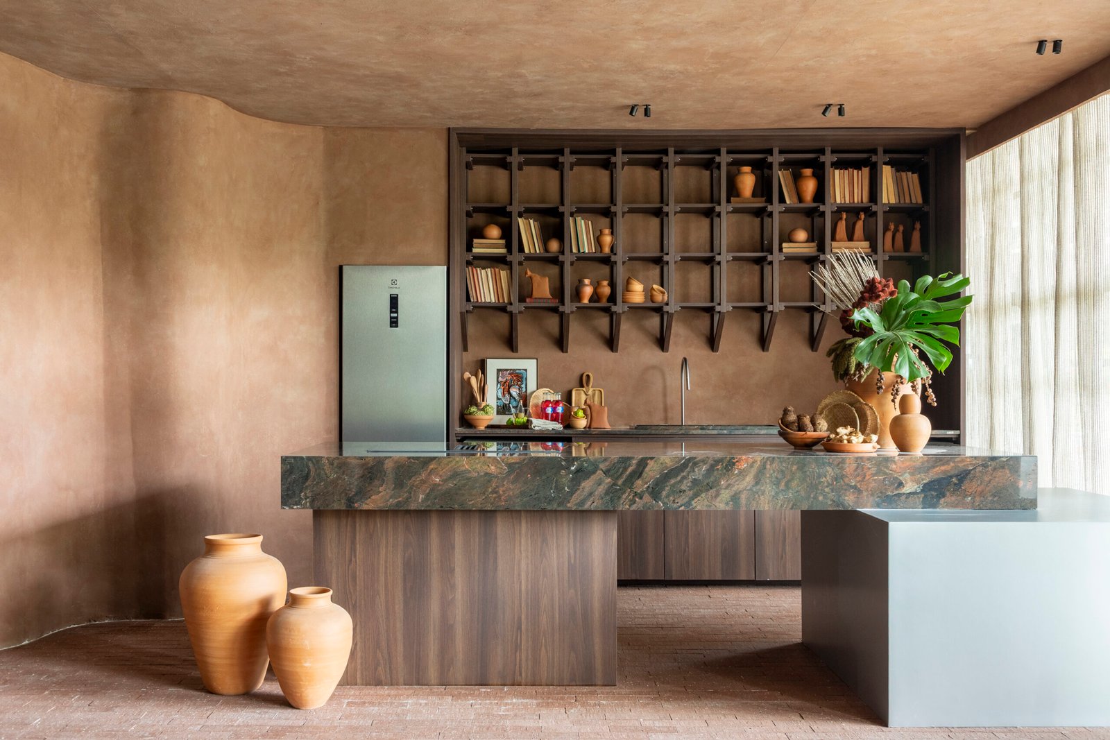 A área social integra o tradicional e o moderno. Artesanato local, mobiliário contemporâneo e obras de Pedro Neves convivem juntos, traduzindo o trânsito entre raiz e cidade.